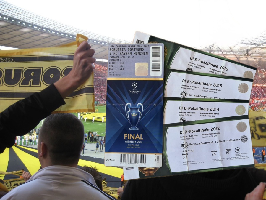Unser Fanclub besitzt zur Zeit drei Dauerkarten (2x Stehplatz / 1x Sitzplatz). Auf Anfrage bestellen wir zusätzlich Tageskarten für Heim- und Auswärtsspiele sowie die Europapokal-Begegnungen unserer Borussia. Wegen der großen Menge an Fanclubs erhalten wir für Auswärtsspiele in der Regel lediglich kleine Kontingente oder gehen sogar komplett leer aus. Dennoch ist es in den vergangenen Jahren immer wieder gelungen, einigen unserer Mitglieder den Besuch der vielen DFB-Pokalendspiele im Berliner Olympiastadion ebenso wie die Unterstützung von Borussia Dortmund in den Champions-League-Finals 2013 und 2024 im Londoner Wembley-Stadion zu ermöglichen. Grundsätzlich werden unsere Eintrittskarten nur an Mitglieder ausgegeben.