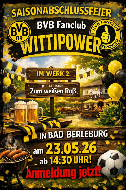 Liebe Mitglieder des BVB Fanclub Wittipower. Hiermit laden wir euch für Samstag, den 23.05.26 recht herzlich zu unserer Abschlussfeier der Saison 2025/2026 ein. Gemeinsam wollen wir das Erreichte feiern, Freundschaften pflegen und den Zusammenhalt unseres Fanclubs stärken. Bei kühlen Getränken und einem leckeren Grillbuffet, erwarten wir euch ab 14:30 Uhr im Werk II des Restaurants "Zum Weißen Roß" in Bad Berleburg, um ein paar gemütliche Stunden miteinander verbringen zu können.